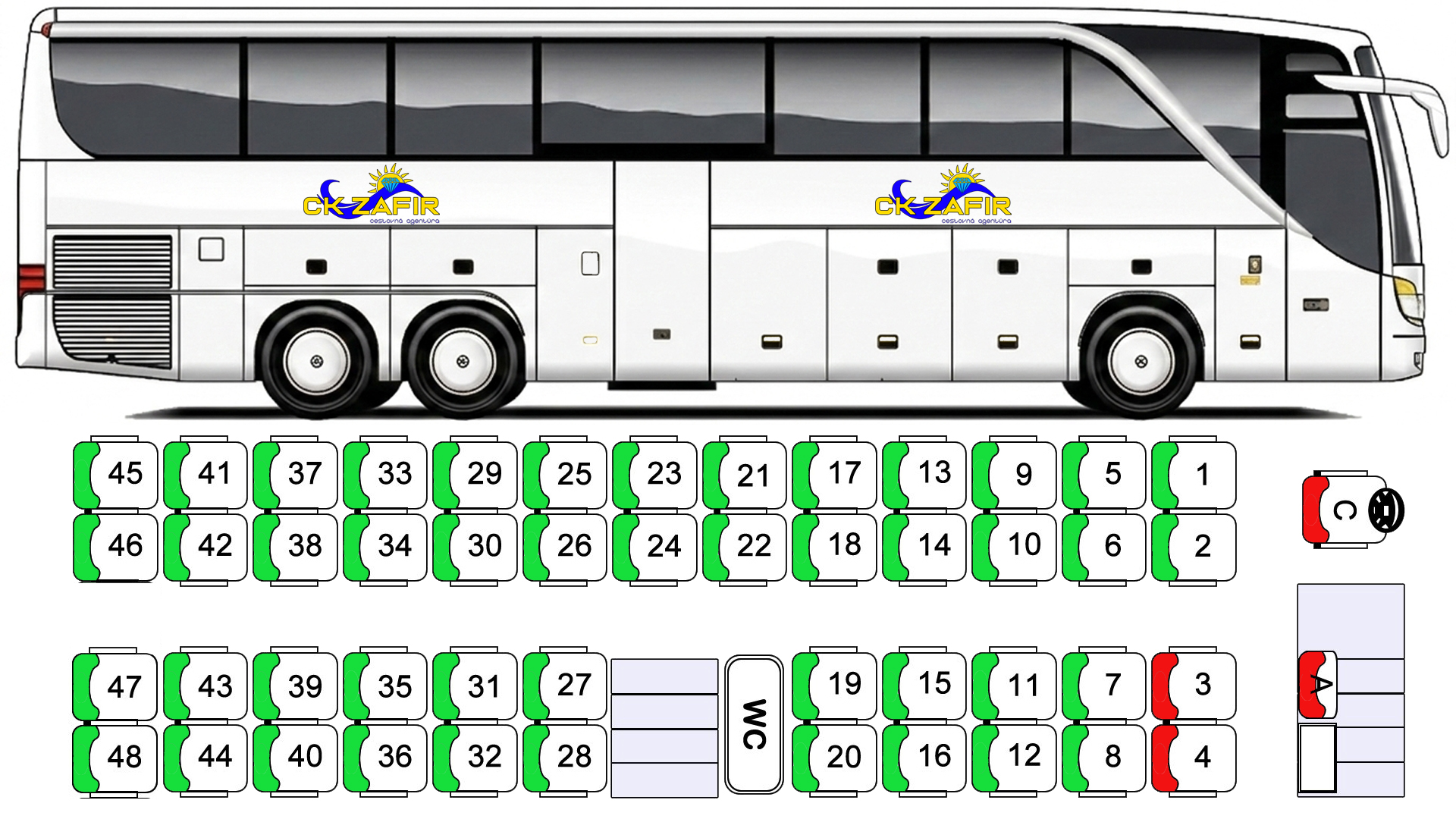 - Miestenka: CA ZAFIR ponúka klientom možnosť výberu konkrétnej miestenky 2 EUR/osobu, je tu možnosť, vybrať si miesto: napr.: za vodičom, za sprievodcom alebo konkrétny rad.